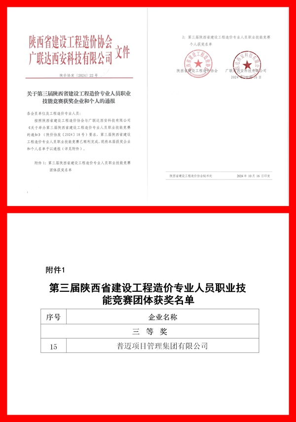 2024年10月17日,第三届陕西省工程造价专业人员技能竞赛获奖结果公布,开云手机端入口-开云(中国)荣获团体三等奖!