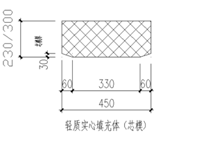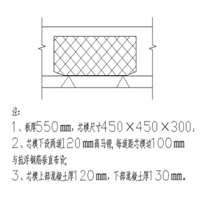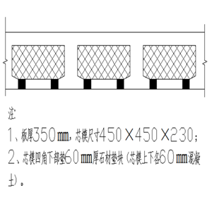车库楼盖采用现浇混凝土空心楼板,空心楼板内模材料采用轻质实体填充体(芯模)。车库柱尺寸为600×600㎜,柱距为6200×8200㎜,托板柱帽尺寸为1800×1800×150㎜和1800×1800×300㎜(如图示1) 。负二层层高为3.3米,柱及梁板混凝土强度均为C35,顶板厚度为350㎜,芯模尺寸为450×450×230㎜,芯模上部和下部各60㎜混凝土,芯模间距80㎜,距暗梁间距80㎜;负一层层高为3.75米,柱及梁板砼强度均为C35,顶板厚度为550㎜,芯模尺寸为450×450×300㎜,芯模上部120㎜混凝土、下部130㎜混凝土,芯模间距80㎜,距暗梁间距80㎜。芯模表面密度、48h浸泡后局部抗压荷载、自然吸水率、抗振动冲击等各项性能参数需符合规范及设计要求。两种芯模的规格尺寸如图示2所示。
