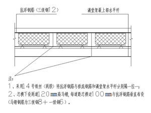 根据弹好的芯模控制线及芯模设计间距安放芯模,芯模安装完成后安装抗浮钢筋同时采用铁丝进行固定。采用双股14#铁丝穿过底模上的定位孔将抗浮钢筋拉结固定在满堂架水平杆上(铁丝严禁拉结在胶合板下的木龙骨上,否则会将整个楼板底模拉起,起不到固定芯模的作用),然后再采用双股14#铁丝隔一将抗浮钢筋与板底筋拉结固定(如图示5、图示6、图示7),防止芯模上浮而增加楼板厚度。